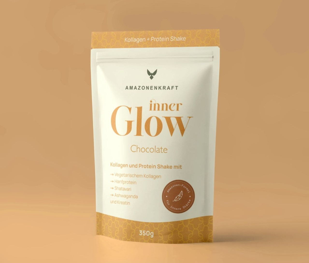 Inner Glow ist ein funktioneller Superfood Shake, von Amazonenkraft als tägliches Ritual für Regeneration, Balance und Kraft. Ein Kollagen und Protein Shake mit vegetarischem Kollagen und Hanfprotein, Shatavari, Ashwaganda und Kreatin.